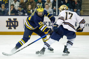 SOUTH BEND, IN – OCTOBER 31: University of Michigan forward TJ Hughes #13 battles for the puck with Notre Dame forward Pano Fimis #17 during a game between University of Michigan and University of Notre Dame at Compton Family Ice Arena on October 31, 2025 in South Bend, Indiana. (Photo by Michael Miller/ISI Photos/ISI Photos via Getty Images)