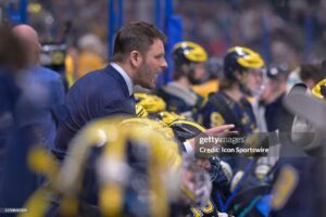 TAMPA, FL – APRIL 06, 2023: Michigan head coach Brandon Naurato gives instruction during the NCAA Division I Men’s Ice Hockey Frozen Four between the Quinnipiac Bobcats and the Michigan Wolverines on April 06, 2023, at Amalie Arena in Tampa, FL. (Photo by Roy K. Miller/Icon Sportswire via Getty Images)