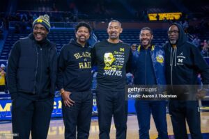 ANN ARBOR, MICHIGAN – JANUARY 15: (L-R) Former Michigan Wolverines “Fab Five” basketball players Chris Webber, Jalen Rose, Juwan Howard, Jimmy King, and Ray Jackson pose at center court after a college basketball game between the Michigan Wolverines and the Ohio State Buckeyes at Crisler Arena on January 15, 2024 in Ann Arbor, Michigan. The Michigan Wolverines won the game 73-65. (Photo by Aaron J. Thornton/Getty Images)